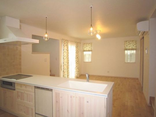 キッチンのカウンターエッジに埋め込んだモザイクタイルは奥様が準備したクローバーの形です。2cmほどのタイルを1枚、1枚埋め込んでくれたタイルの職人さん、本当にありがとう!です。照明や雑貨などがプロヴァンスの暮らしを演出しています。