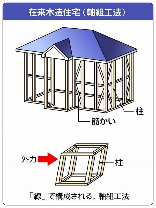 2×4工法に比べ、地震や風圧に対する強度を出しにくい構造です。
