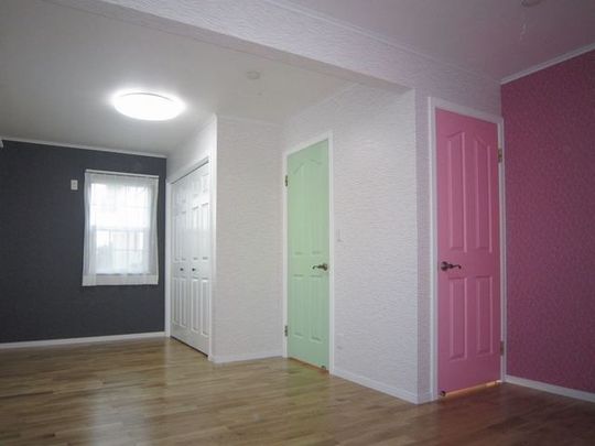 内装は木の温もりを感じる事のできる無垢フローリングに、木製のドア、キッチン扉も木製で仕上げました。大きめの化粧梁良いアクセントになりますね。