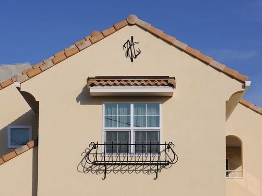 外壁には「イエローベージュ色」の塗り壁で仕上げ、テラコッタの洋瓦を2色(オレンジ、アイボリー)混ぜて使用…アクセントにと、アイアンの妻飾りとフラワーBOXを取付けました。