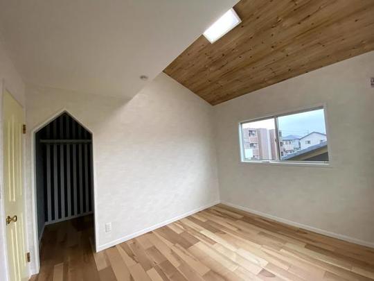 主寝室の扉は黄色に塗装☆勾配天井のデザインが素敵です。